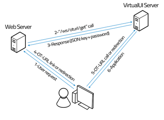 A usual scenario involves a backend service (ie. a web server), where the user’s credentials are validated. This backend service communicates with a VirtualUI Server to request the creation of a One-Time URL, passing information about the application to run, credentials and custom data. This information is stored temporarily and indexed by a unique access key. Also a random passcode is created and used to encrypt the stored information. This access key and passcode are returned to the backend service to build the final One-Time URL.