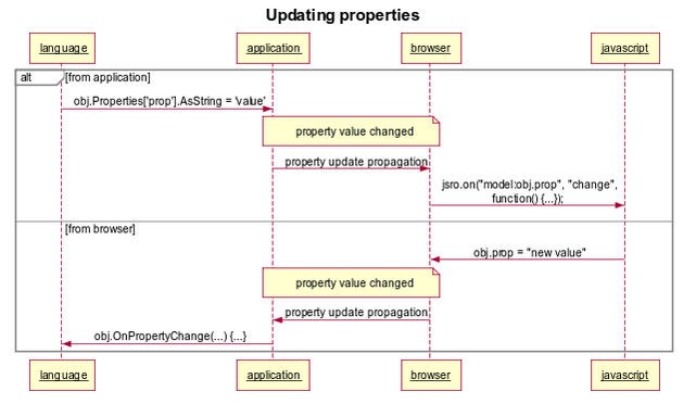 jsRO will keep each property synchronized in the browser and in the application. Each time a property is updated in the server side, this change triggers an event to the browser, where it can be handled by the corresponding on(“model:object.property”, “change”, …) event, if this event was declared. Similarly, when a property is updated in the browser, this change travels to the application and triggers the object.OnPropertyChange and property.OnSet events.