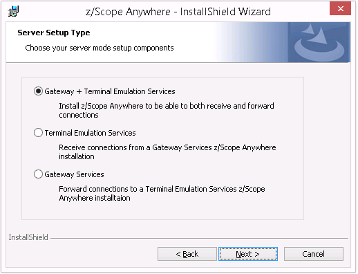 Terminal Emulation Services: Under this role, z/Scope Anywhere only processes forwarded connections. The Server is responsible for establishing and processing the connections assigned by the Gateway.
