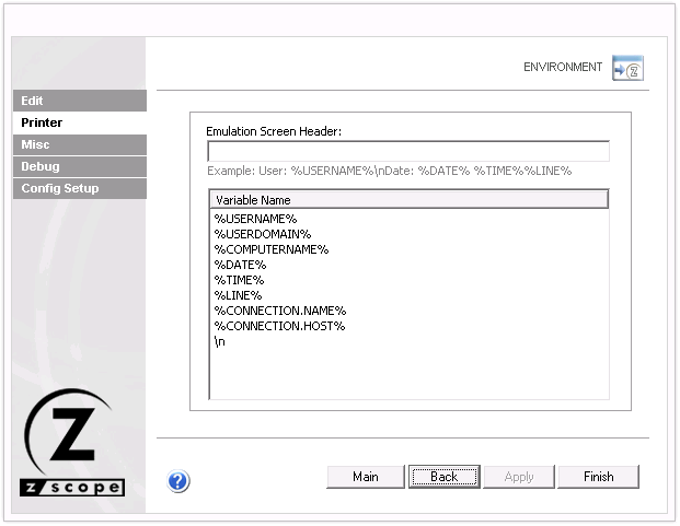 Emulation Screen Header Type a sentence that will show as a header of all the host's print screens. Use the variables listed below: "Print screen taken by %USERNAME% in %COMPUTERNAME% at %TIME%"