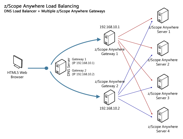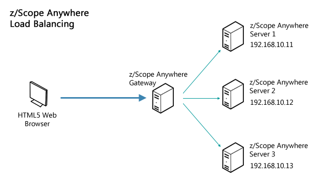 If you arrive to the conclusion that your z/Scope Anywhere environment would benefit from using load balancing, you can choose between two possible architectures. This decision is an essential step in planning the hardware scheme and configuring the system to work in a distributed way.